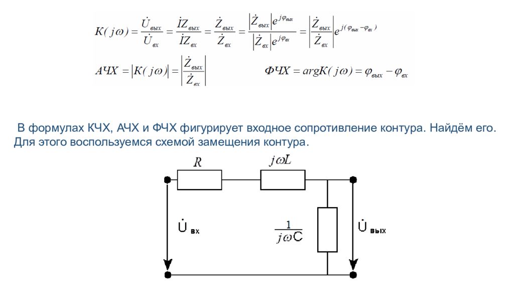 В формулах КЧХ, АЧХ и ФЧХ фигурирует входное сопротивление контура. Найдём его. Для этого воспользуемся схемой замещения контура.
