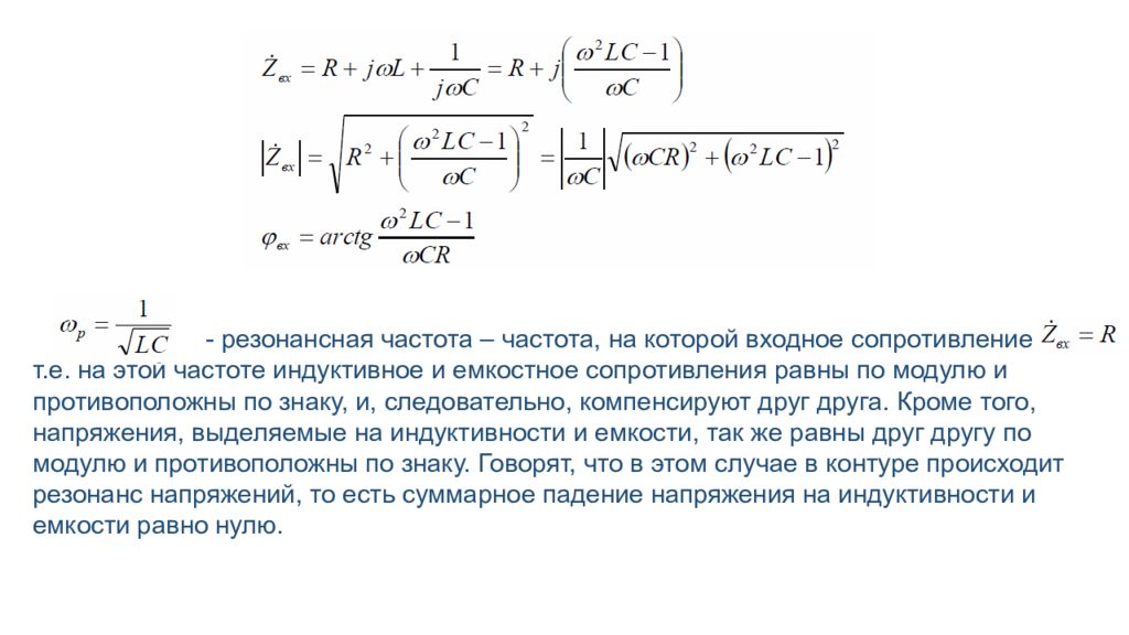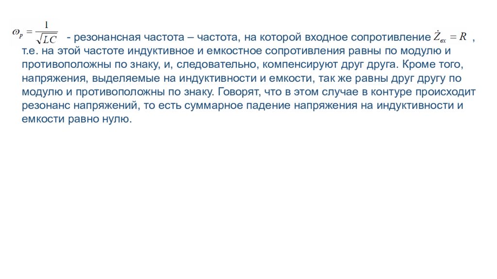 - - резонансная частота – частота, на которой входное сопротивление, т.е. на этой частоте индуктивное и емкостное сопротивления равны по модулю и противоположны по знаку, и, следовательно, компенсируют друг друга. Кроме того, напряжения, выделяемые на индуктивности и емкости, так же равны друг другу по модулю и противоположны по знаку. Говорят, что в этом случае в контуре происходит резонанс напряжений, то есть суммарное падение напряжения на индуктивности и емкости равно нулю.