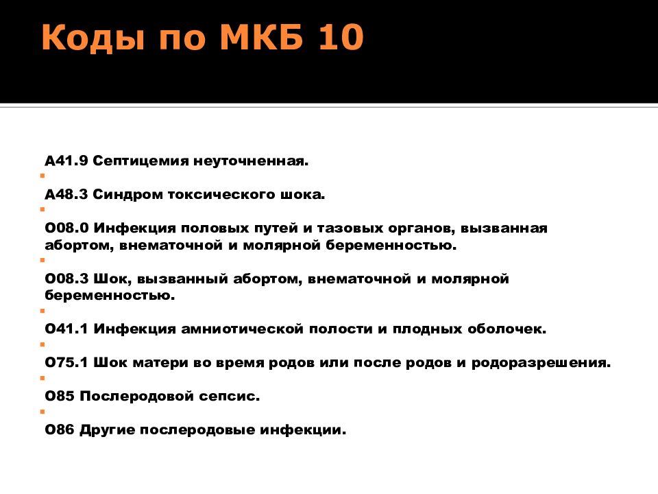 A41.9 Септицемия неуточненная. A48.3 Синдром токсического шока. O08.0 Инфекция половых путей и тазовых органов, вызванная абортом, внематочной и молярной беременностью. O08.3 Шок, вызванный абортом, внематочной и молярной беременностью. O41.1 Инфекция амниотической полости и плодных оболочек. O75.1 Шок матери во время родов или после родов и родоразрешения. O85 Послеродовой сепсис. O86 Другие послеродовые инфекции.