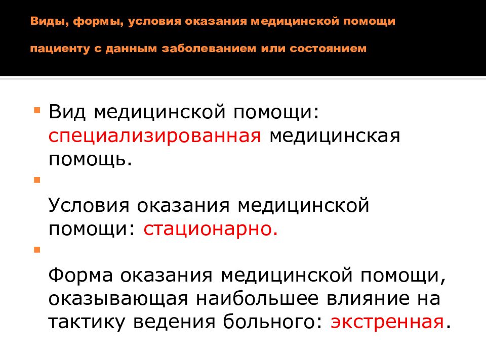 Вид медицинской помощи: специализированная медицинская помощь. Условия оказания медицинской помощи: стационарно. Форма оказания медицинской помощи, оказывающая наибольшее влияние на тактику ведения больного: экстренная.