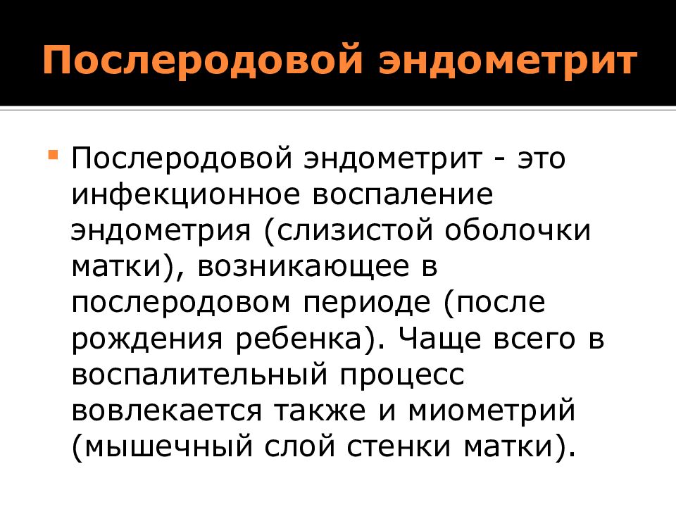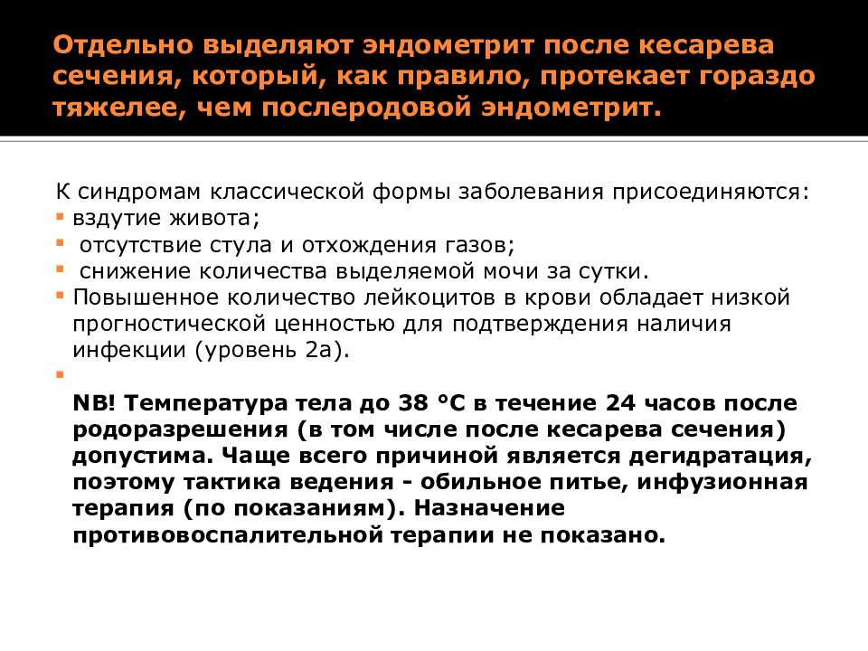 Слайд 28: Отдельно выделяют эндометрит после кесарева сечения, который, как правило, протекает гораздо тяжелее, чем послеродовой эндометрит