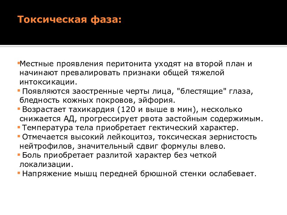 Местные проявления перитонита уходят на второй план и начинают превалировать признаки общей тяжелой интоксикации. Появляются заостренные черты лица, "блестящие" глаза, бледность кожных покровов, эйфория. Возрастает тахикардия (120 и выше в мин), несколько снижается АД, прогрессирует рвота застойным содержимым. Температура тела приобретает гектический характер. Отмечается высокий лейкоцитоз, токсическая зернистость нейтрофилов, значительный сдвиг формулы влево. Боль приобретает разлитой характер без четкой локализации. Напряжение мышц передней брюшной стенки ослабевает.