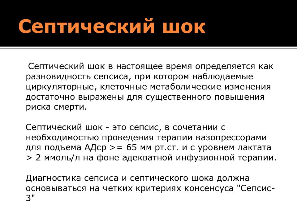 Септический шок в настоящее время определяется как разновидность сепсиса, при котором наблюдаемые циркуляторные, клеточные метаболические изменения достаточно выражены для существенного повышения риска смерти. Септический шок - это сепсис, в сочетании с необходимостью проведения терапии вазопрессорами для подъема АДср >= 65 мм рт.ст. и с уровнем лактата > 2 ммоль /л на фоне адекватной инфузионной терапии. Диагностика сепсиса и септического шока должна основываться на четких критериях консенсуса "Сепсис-3"