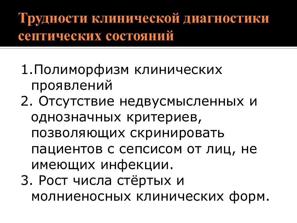 1.Полиморфизм клинических проявлений 2. Отсутствие недвусмысленных и однозначных критериев, позволяющих скринировать пациентов с сепсисом от лиц, не имеющих инфекции. 3. Рост числа стёртых и молниеносных клинических форм.