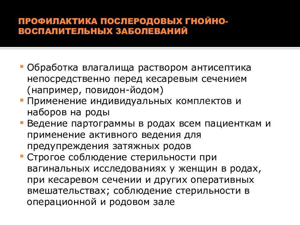 Обработка влагалища раствором антисептика непосредственно перед кесаревым сечением (например, повидон-йодом ) Применение индивидуальных комплектов и наборов на роды Ведение партограммы в родах всем пациенткам и применение активного ведения для предупреждения затяжных родов Строгое соблюдение стерильности при вагинальных исследованиях у женщин в родах, при кесаревом сечении и других оперативных вмешательствах; соблюдение стерильности в операционной и родовом зале