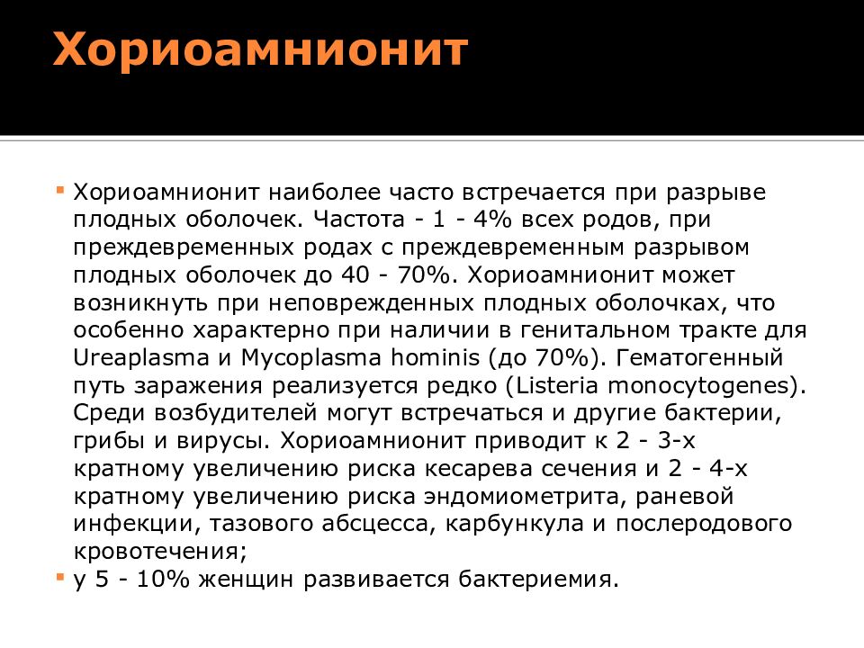 Хориоамнионит наиболее часто встречается при разрыве плодных оболочек. Частота - 1 - 4% всех родов, при преждевременных родах с преждевременным разрывом плодных оболочек до 40 - 70%. Хориоамнионит может возникнуть при неповрежденных плодных оболочках, что особенно характерно при наличии в генитальном тракте для Ureaplasma и Mycoplasma hominis (до 70%). Гематогенный путь заражения реализуется редко ( Listeria monocytogenes ). Среди возбудителей могут встречаться и другие бактерии, грибы и вирусы. Хориоамнионит приводит к 2 - 3-х кратному увеличению риска кесарева сечения и 2 - 4-х кратному увеличению риска эндомиометрита, раневой инфекции, тазового абсцесса, карбункула и послеродового кровотечения; у 5 - 10% женщин развивается бактериемия.