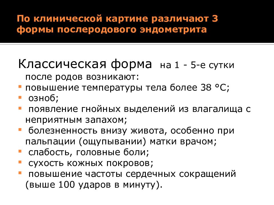 Классическая форма на 1 - 5-е сутки после родов возникают: повышение температуры тела более 38 °C; озноб; появление гнойных выделений из влагалища с неприятным запахом; болезненность внизу живота, особенно при пальпации (ощупывании) матки врачом; слабость, головные боли; сухость кожных покровов; повышение частоты сердечных сокращений (выше 100 ударов в минуту).