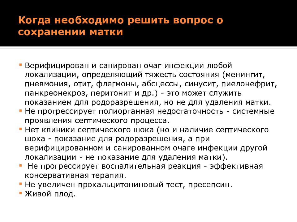 Верифицирован и санирован очаг инфекции любой локализации, определяющий тяжесть состояния (менингит, пневмония, отит, флегмоны, абсцессы, синусит, пиелонефрит, панкреонекроз, перитонит и др.) - это может служить показанием для родоразрешения, но не для удаления матки. Не прогрессирует полиорганная недостаточность - системные проявления септического процесса. Нет клиники септического шока (но и наличие септического шока - показание для родоразрешения, а при верифицированном и санированном очаге инфекции другой локализации - не показание для удаления матки). Не прогрессирует воспалительная реакция - эффективная консервативная терапия. Не увеличен прокальцитониновый тест, пресепсин. Живой плод.