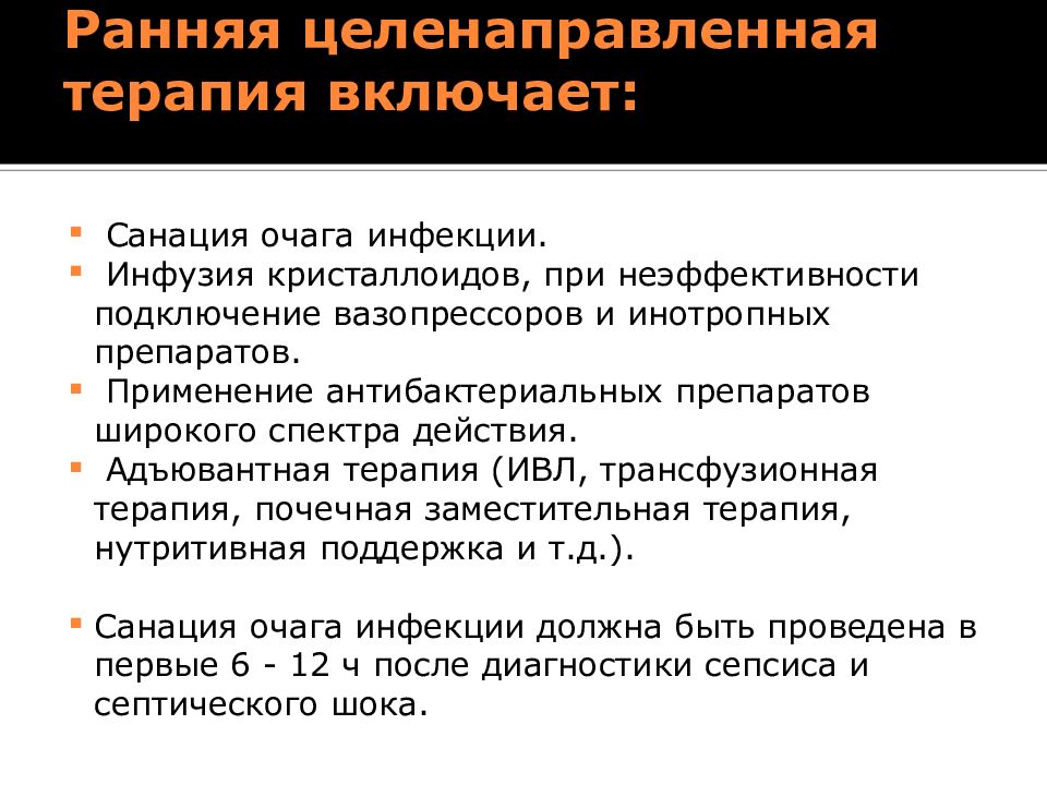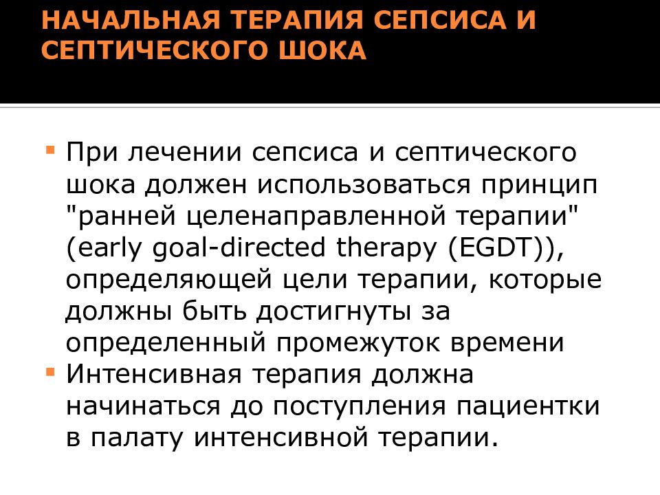 При лечении сепсиса и септического шока должен использоваться принцип "ранней целенаправленной терапии" ( early goal-directed therapy (EGDT)), определяющей цели терапии, которые должны быть достигнуты за определенный промежуток времени Интенсивная терапия должна начинаться до поступления пациентки в палату интенсивной терапии.