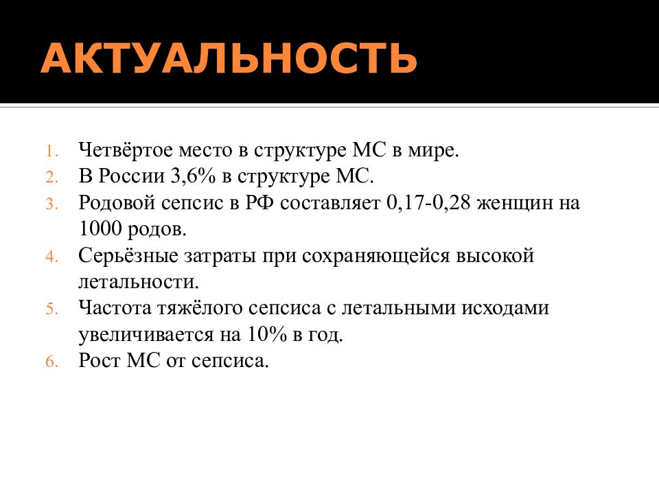 Четвёртое место в структуре МС в мире. В России 3,6% в структуре МС. Родовой сепсис в РФ составляет 0,17-0,28 женщин на 1000 родов. Серьёзные затраты при сохраняющейся высокой летальности. Частота тяжёлого сепсиса с летальными исходами увеличивается на 10% в год. Рост МС от сепсиса.