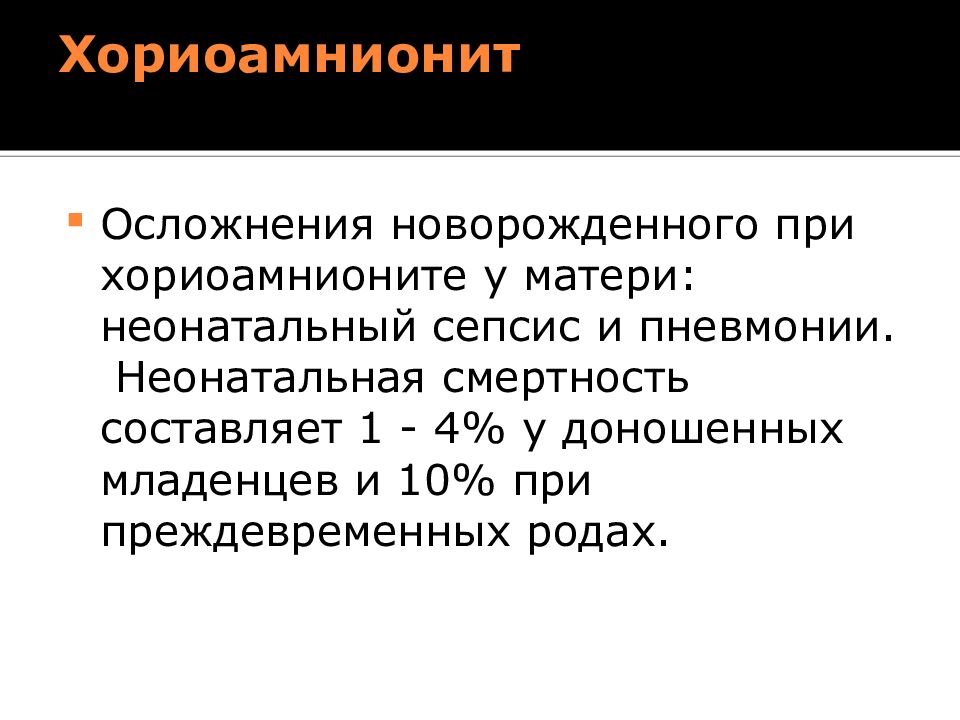 Осложнения новорожденного при хориоамнионите у матери: неонатальный сепсис и пневмонии. Неонатальная смертность составляет 1 - 4% у доношенных младенцев и 10% при преждевременных родах.