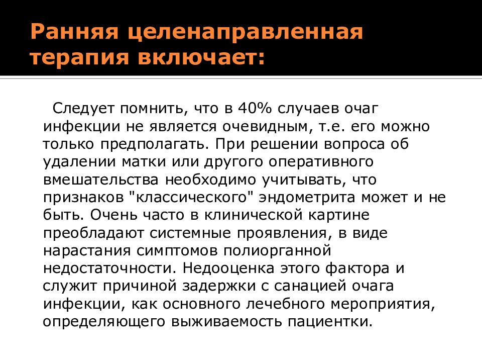 Следует помнить, что в 40% случаев очаг инфекции не является очевидным, т.е. его можно только предполагать. При решении вопроса об удалении матки или другого оперативного вмешательства необходимо учитывать, что признаков "классического" эндометрита может и не быть. Очень часто в клинической картине преобладают системные проявления, в виде нарастания симптомов полиорганной недостаточности. Недооценка этого фактора и служит причиной задержки с санацией очага инфекции, как основного лечебного мероприятия, определяющего выживаемость пациентки.