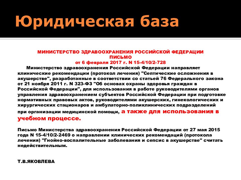 МИНИСТЕРСТВО ЗДРАВООХРАНЕНИЯ РОССИЙСКОЙ ФЕДЕРАЦИИ ПИСЬМО от 6 февраля 2017 г. N 15-4/10/2-728 Министерство здравоохранения Российской Федерации направляет клинические рекомендации (протокол лечения) "Септические осложнения в акушерстве", разработанные в соответствии со статьей 76 Федерального закона от 21 ноября 2011 г. N 323-ФЗ "Об основах охраны здоровья граждан в Российской Федерации", для использования в работе руководителями органов управления здравоохранением субъектов Российской Федерации при подготовке нормативных правовых актов, руководителями акушерских, гинекологических и хирургических стационаров и амбулаторно-поликлинических подразделений при организации медицинской помощи, а также для использования в учебном процессе. Письмо Министерства здравоохранения Российской Федерации от 27 мая 2015 года N 15-4/10/2-2469 о направлении клинических рекомендаций (протокола лечения) "Гнойно-воспалительные заболевания и сепсис в акушерстве" считать недействительным. Т.В.ЯКОВЛЕВА