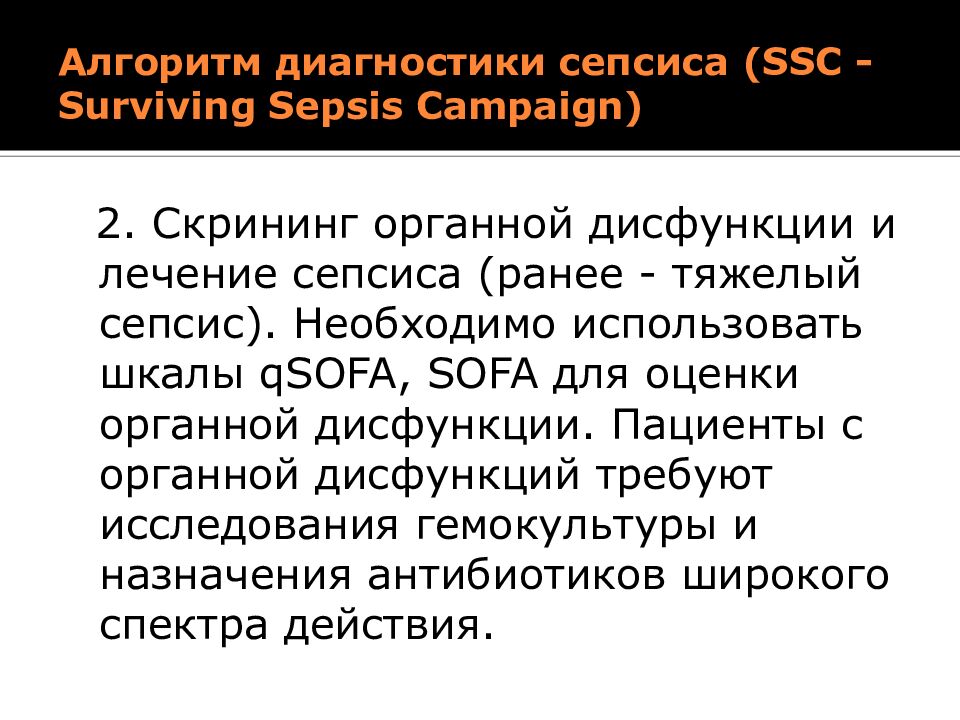 2. Скрининг органной дисфункции и лечение сепсиса (ранее - тяжелый сепсис). Необходимо использовать шкалы qSOFA, SOFA для оценки органной дисфункции. Пациенты с органной дисфункций требуют исследования гемокультуры и назначения антибиотиков широкого спектра действия.