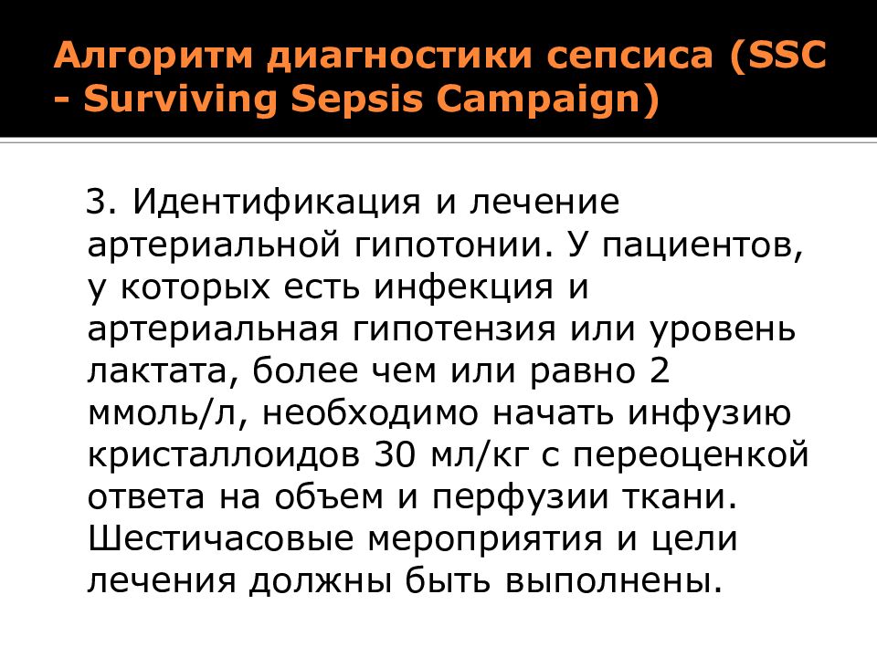 3. Идентификация и лечение артериальной гипотонии. У пациентов, у которых есть инфекция и артериальная гипотензия или уровень лактата, более чем или равно 2 ммоль /л, необходимо начать инфузию кристаллоидов 30 мл/кг с переоценкой ответа на объем и перфузии ткани. Шестичасовые мероприятия и цели лечения должны быть выполнены.