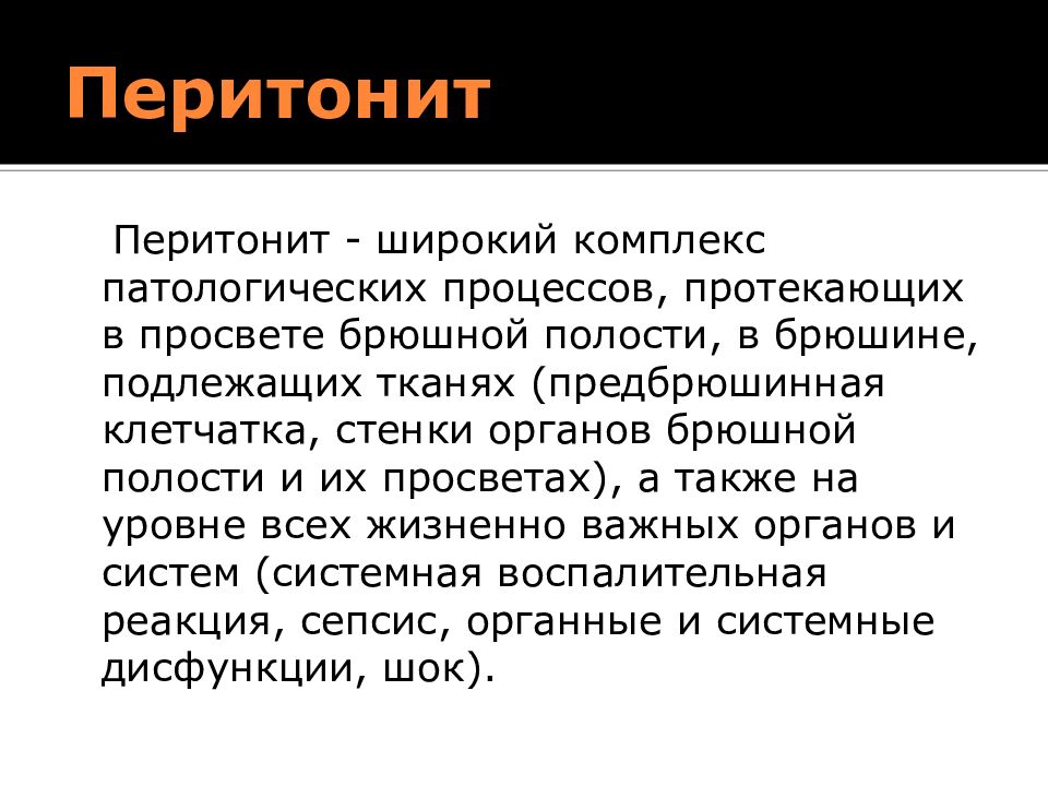 Перитонит - широкий комплекс патологических процессов, протекающих в просвете брюшной полости, в брюшине, подлежащих тканях ( предбрюшинная клетчатка, стенки органов брюшной полости и их просветах), а также на уровне всех жизненно важных органов и систем (системная воспалительная реакция, сепсис, органные и системные дисфункции, шок).
