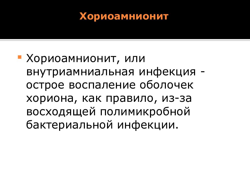Хориоамнионит, или внутриамниальная инфекция - острое воспаление оболочек хориона, как правило, из-за восходящей полимикробной бактериальной инфекции.
