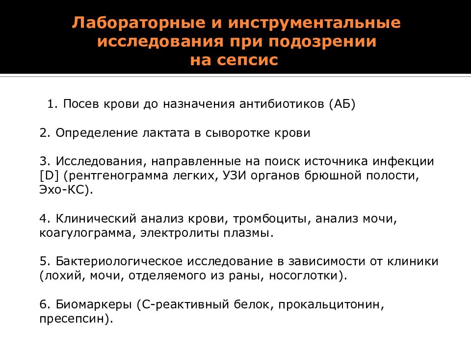Слайд 42: Лабораторные и инструментальные исследования при подозрении на сепсис