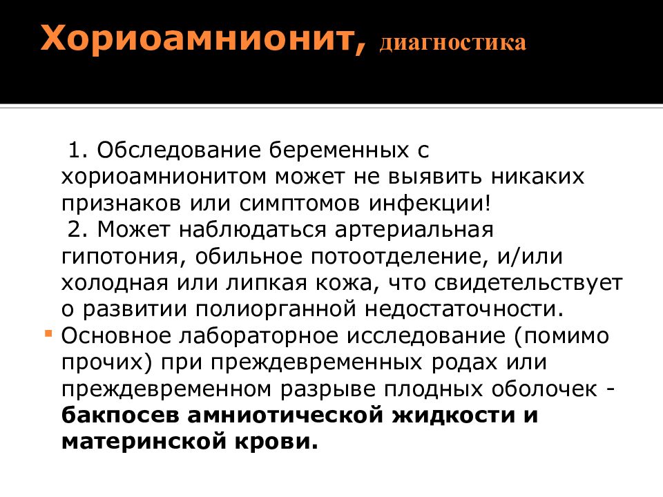 1. Обследование беременных с хориоамнионитом может не выявить никаких признаков или симптомов инфекции! 2. М ожет наблюдаться артериальная гипотония, обильное потоотделение, и/или холодная или липкая кожа, что свидетельствует о развитии полиорганной недостаточности. Основное лабораторное исследование (помимо прочих) при преждевременных родах или преждевременном разрыве плодных оболочек - бакпосев амниотической жидкости и материнской крови.