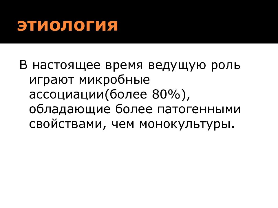 В настоящее время ведущую роль играют микробные ассоциации(более 80%), обладающие более патогенными свойствами, чем монокультуры.