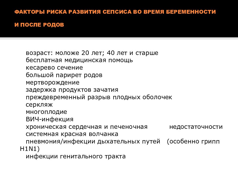 возраст: моложе 20 лет; 40 лет и старше бесплатная медицинская помощь кесарево сечение большой парирет родов мертворождение задержка продуктов зачатия преждевременный разрыв плодных оболочек серкляж многоплодие ВИЧ-инфекция хроническая сердечная и печеночная недостаточности системная красная волчанка пневмония/инфекции дыхательных путей ( особенно грипп H1N1) инфекции генитального тракта