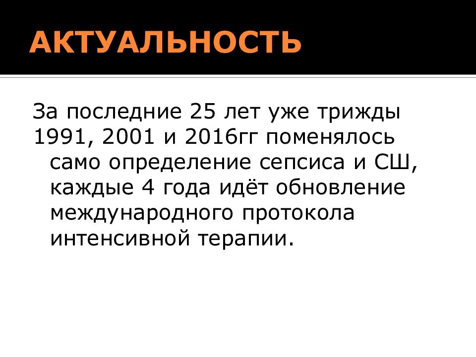 За последние 25 лет уже трижды 1991, 2001 и 2016гг поменялось само определение сепсиса и СШ, каждые 4 года идёт обновление международного протокола интенсивной терапии.
