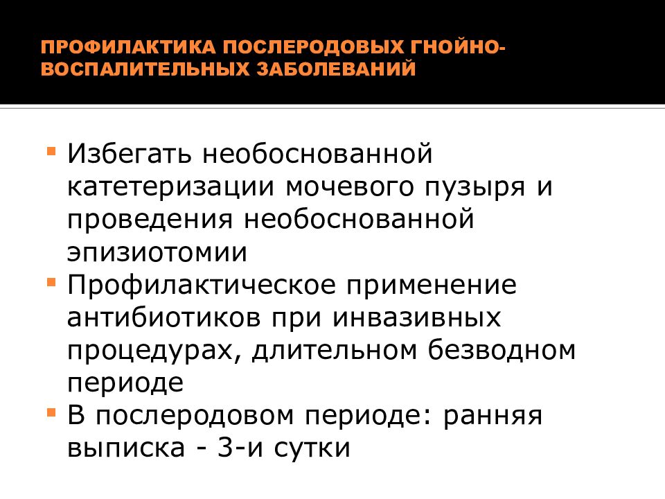 Избегать необоснованной катетеризации мочевого пузыря и проведения необоснованной эпизиотомии Профилактическое применение антибиотиков при инвазивных процедурах, длительном безводном периоде В послеродовом периоде: ранняя выписка - 3-и сутки