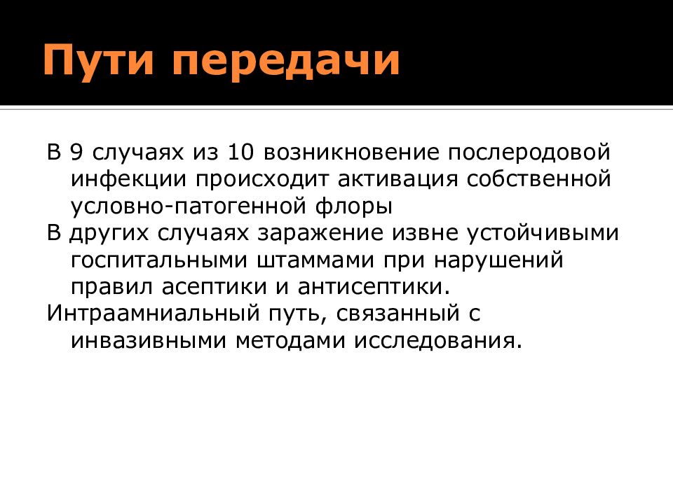В 9 случаях из 10 возникновение послеродовой инфекции происходит активация собственной условно-патогенной флоры В других случаях заражение извне устойчивыми госпитальными штаммами при нарушений правил асептики и антисептики. Интраамниальный путь, связанный с инвазивными методами исследования.