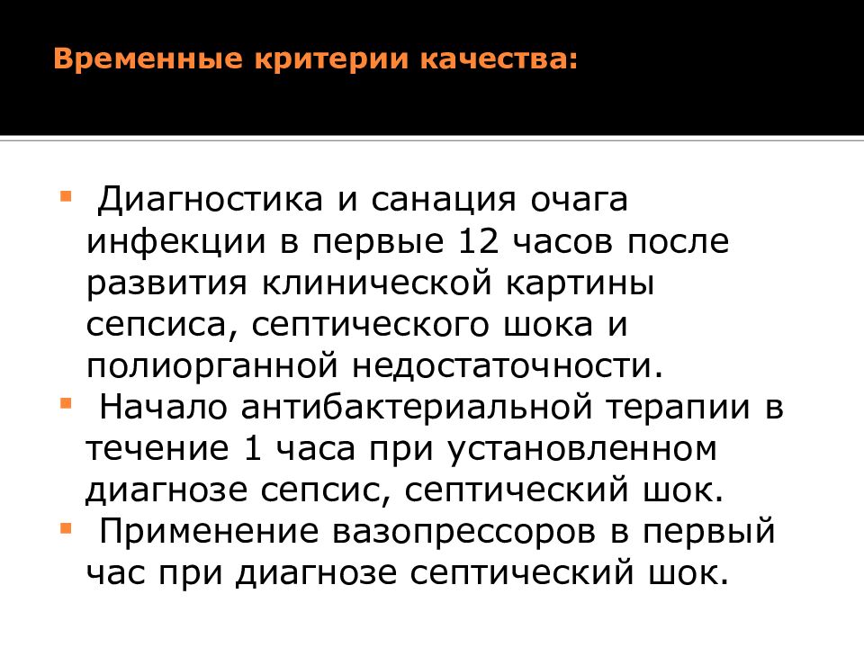Диагностика и санация очага инфекции в первые 12 часов после развития клинической картины сепсиса, септического шока и полиорганной недостаточности. Начало антибактериальной терапии в течение 1 часа при установленном диагнозе сепсис, септический шок. Применение вазопрессоров в первый час при диагнозе септический шок.
