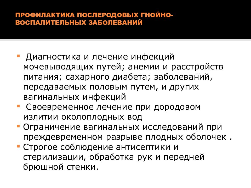 Диагностика и лечение инфекций мочевыводящих путей; анемии и расстройств питания; сахарного диабета; заболеваний, передаваемых половым путем, и других вагинальных инфекций Своевременное лечение при дородовом излитии околоплодных вод Ограничение вагинальных исследований при преждевременном разрыве плодных оболочек. Строгое соблюдение антисептики и стерилизации, обработка рук и передней брюшной стенки.