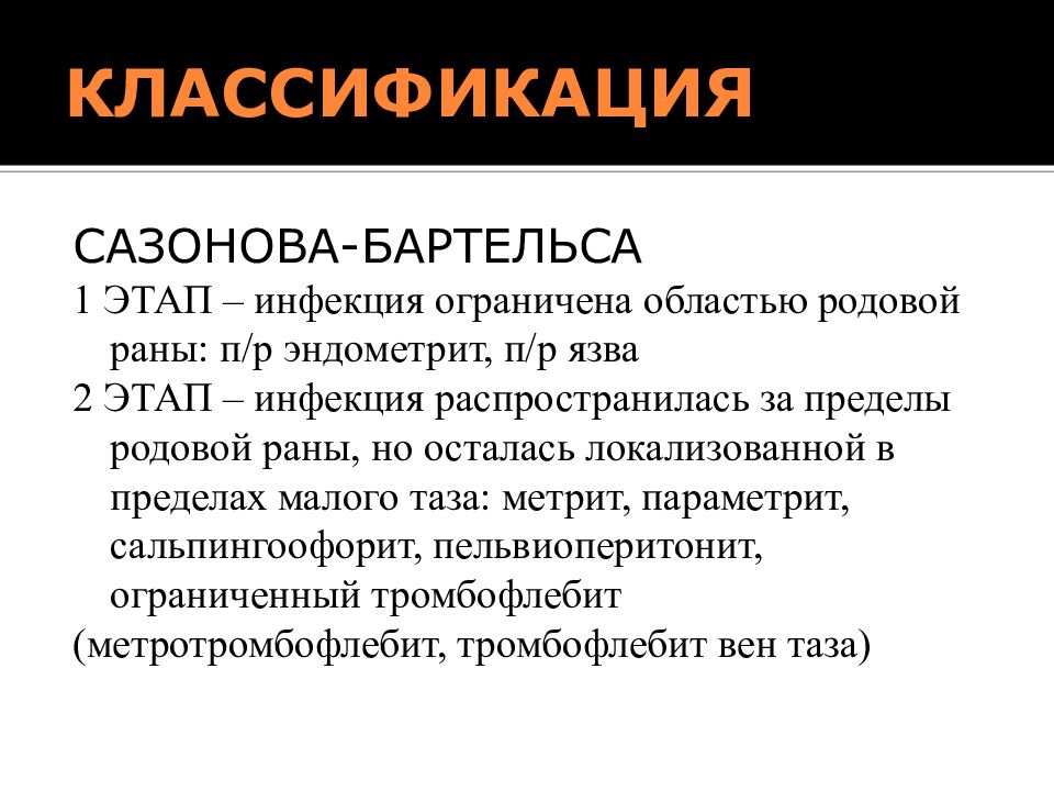 САЗОНОВА-БАРТЕЛЬСА 1 ЭТАП – инфекция ограничена областью родовой раны: п / р эндометрит, п / р язва 2 ЭТАП – инфекция распространилась за пределы родовой раны, но осталась локализованной в пределах малого таза: метрит, параметрит, сальпингоофорит, пельвиоперитонит, ограниченный тромбофлебит (метротромбофлебит, тромбофлебит вен таза)