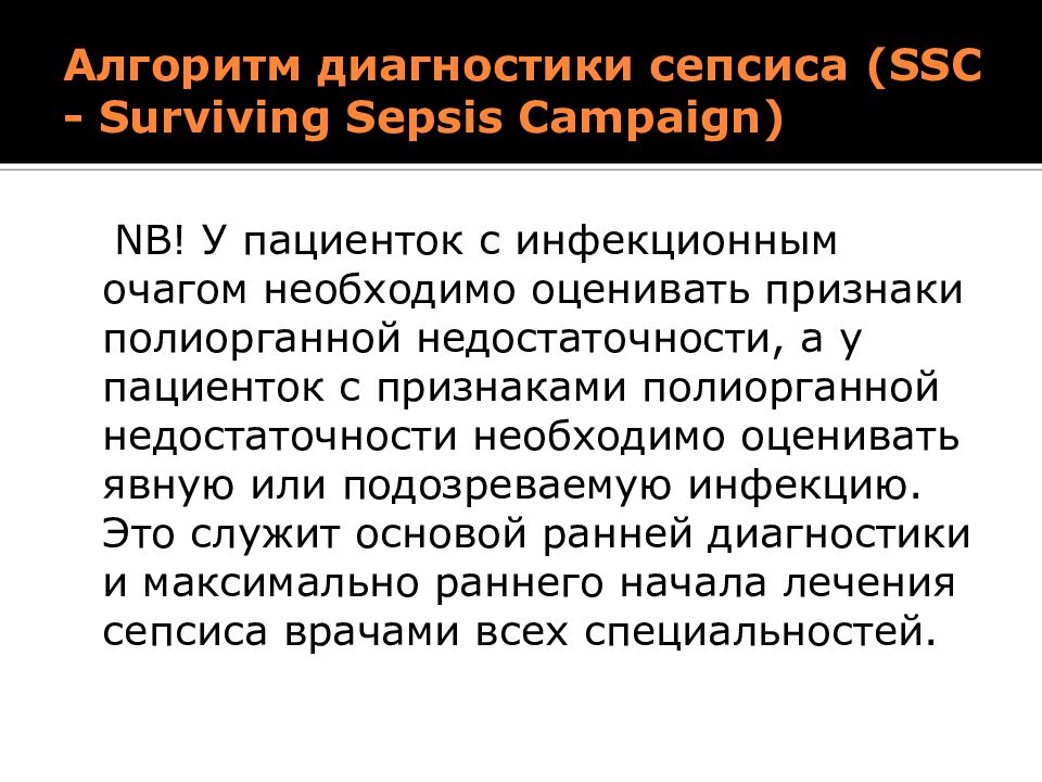 NB ! У пациенток с инфекционным очагом необходимо оценивать признаки полиорганной недостаточности, а у пациенток с признаками полиорганной недостаточности необходимо оценивать явную или подозреваемую инфекцию. Это служит основой ранней диагностики и максимально раннего начала лечения сепсиса врачами всех специальностей.