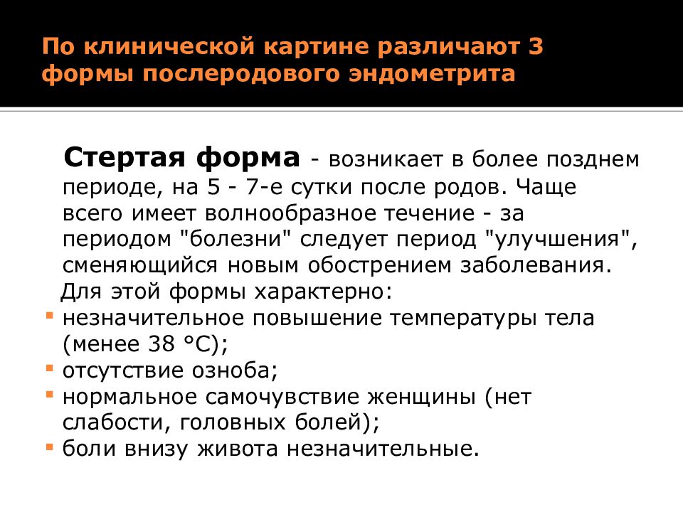 Стертая форма - возникает в более позднем периоде, на 5 - 7-е сутки после родов. Чаще всего имеет волнообразное течение - за периодом "болезни" следует период "улучшения", сменяющийся новым обострением заболевания. Для этой формы характерно: незначительное повышение температуры тела (менее 38 °C); отсутствие озноба; нормальное самочувствие женщины (нет слабости, головных болей); боли внизу живота незначительные.