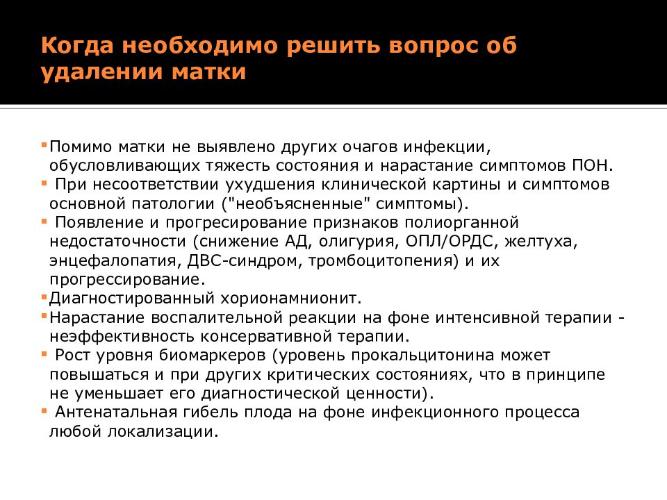 Помимо матки не выявлено других очагов инфекции, обусловливающих тяжесть состояния и нарастание симптомов ПОН. При несоответствии ухудшения клинической картины и симптомов основной патологии ("необъясненные" симптомы). Появление и прогресирование признаков полиорганной недостаточности (снижение АД, олигурия, ОПЛ/ОРДС, желтуха, энцефалопатия, ДВС-синдром, тромбоцитопения) и их прогрессирование. Диагностированный хорионамнионит. Нарастание воспалительной реакции на фоне интенсивной терапии - неэффективность консервативной терапии. Рост уровня биомаркеров (уровень прокальцитонина может повышаться и при других критических состояниях, что в принципе не уменьшает его диагностической ценности). Антенатальная гибель плода на фоне инфекционного процесса любой локализации.
