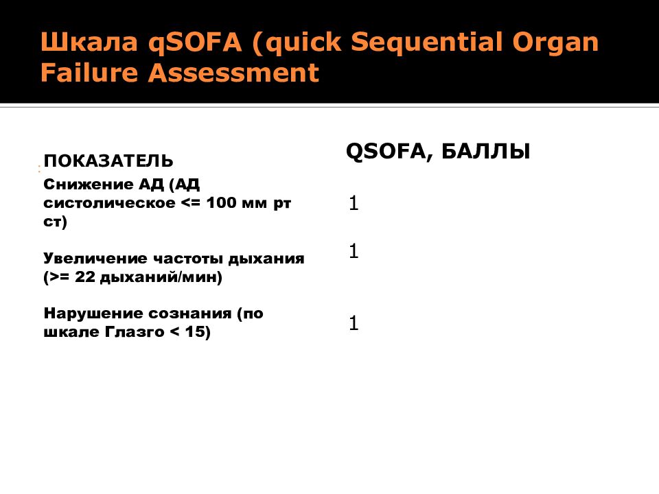 Показатель Снижение АД (АД систолическое <= 100 мм рт ст ) Увеличение частоты дыхания (>= 22 дыханий/мин) Нарушение сознания (по шкале Глазго < 15) qSOFA, баллы 1 1 1