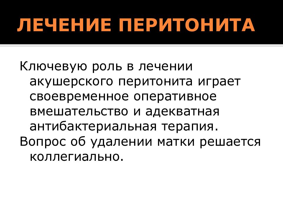 Ключевую роль в лечении акушерского перитонита играет своевременное оперативное вмешательство и адекватная антибактериальная терапия. Вопрос об удалении матки решается коллегиально.