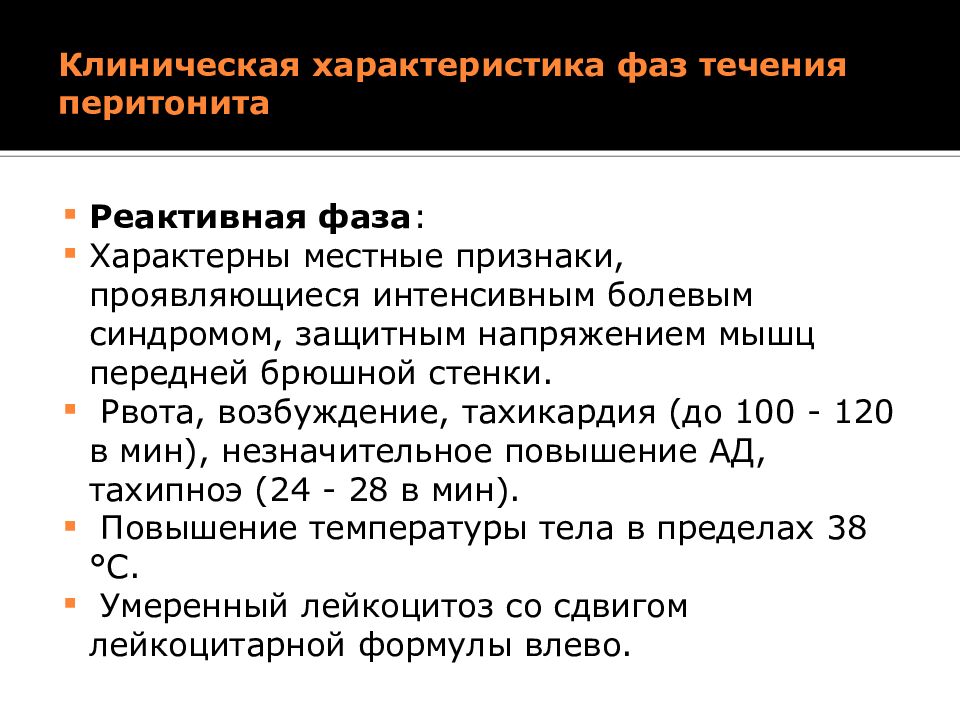 Реактивная фаза : Характерны местные признаки, проявляющиеся интенсивным болевым синдромом, защитным напряжением мышц передней брюшной стенки. Рвота, возбуждение, тахикардия (до 100 - 120 в мин), незначительное повышение АД, тахипноэ (24 - 28 в мин). Повышение температуры тела в пределах 38 °C. Умеренный лейкоцитоз со сдвигом лейкоцитарной формулы влево.