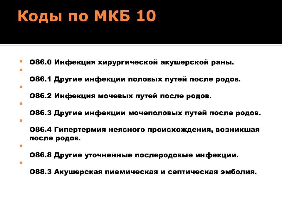 O86.0 Инфекция хирургической акушерской раны. O86.1 Другие инфекции половых путей после родов. O86.2 Инфекция мочевых путей после родов. O86.3 Другие инфекции мочеполовых путей после родов. O86.4 Гипертермия неясного происхождения, возникшая после родов. O86.8 Другие уточненные послеродовые инфекции. O88.3 Акушерская пиемическая и септическая эмболия.