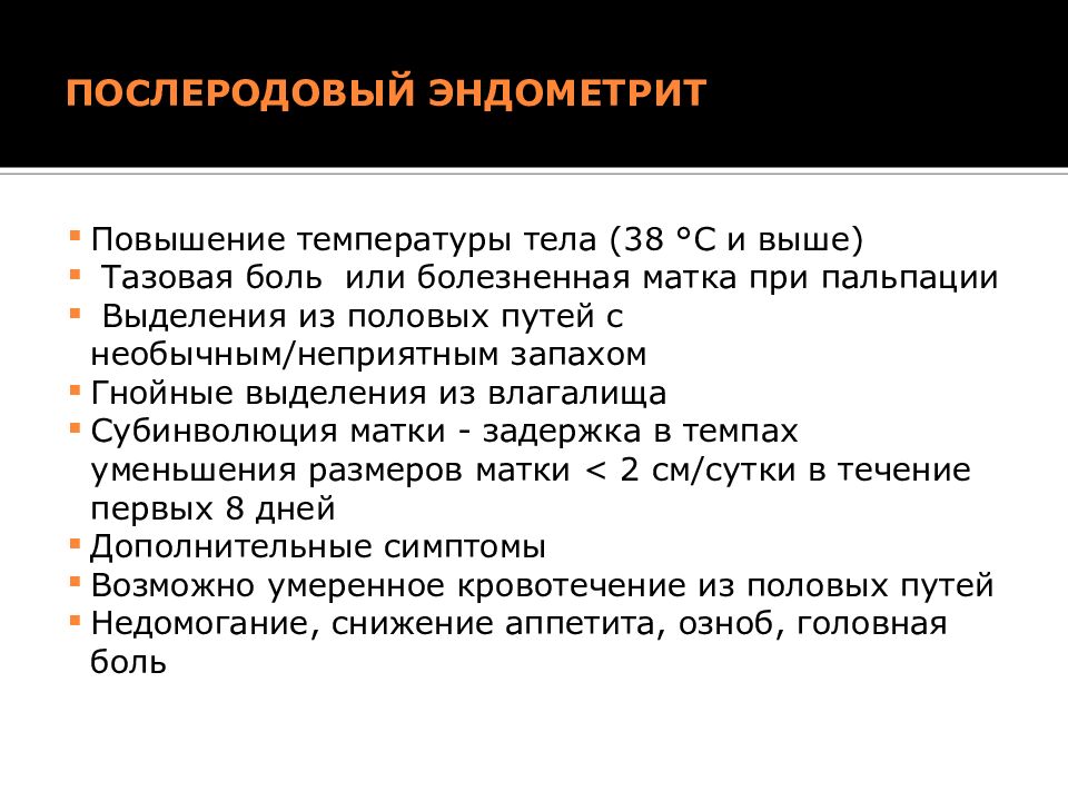 Повышение температуры тела (38 °C и выше) Тазовая боль или болезненная матка при пальпации Выделения из половых путей с необычным/неприятным запахом Гнойные выделения из влагалища Субинволюция матки - задержка в темпах уменьшения размеров матки < 2 см/сутки в течение первых 8 дней Дополнительные симптомы Возможно умеренное кровотечение из половых путей Недомогание, снижение аппетита, озноб, головная боль