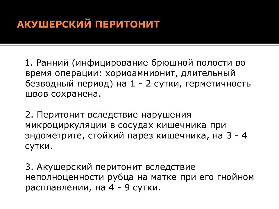 1. Ранний (инфицирование брюшной полости во время операции: хориоамнионит, длительный безводный период) на 1 - 2 сутки, герметичность швов сохранена. 2. Перитонит вследствие нарушения микроциркуляции в сосудах кишечника при эндометрите, стойкий парез кишечника, на 3 - 4 сутки. 3. Акушерский перитонит вследствие неполноценности рубца на матке при его гнойном расплавлении, на 4 - 9 сутки.