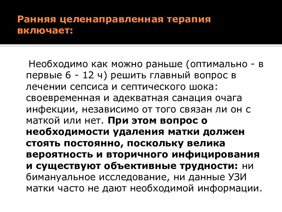Необходимо как можно раньше (оптимально - в первые 6 - 12 ч) решить главный вопрос в лечении сепсиса и септического шока: своевременная и адекватная санация очага инфекции, независимо от того связан ли он с маткой или нет. При этом вопрос о необходимости удаления матки должен стоять постоянно, поскольку велика вероятность и вторичного инфицирования и существуют объективные трудности: ни бимануальное исследование, ни данные УЗИ матки часто не дают необходимой информации.