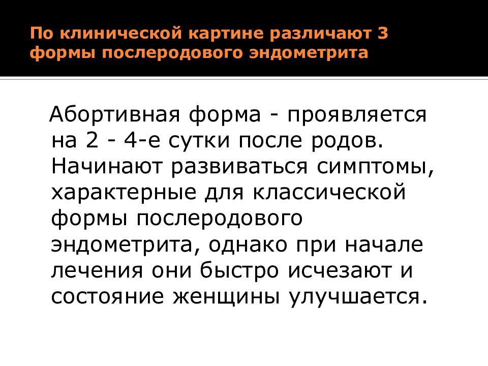 Абортивная форма - проявляется на 2 - 4-е сутки после родов. Начинают развиваться симптомы, характерные для классической формы послеродового эндометрита, однако при начале лечения они быстро исчезают и состояние женщины улучшается.