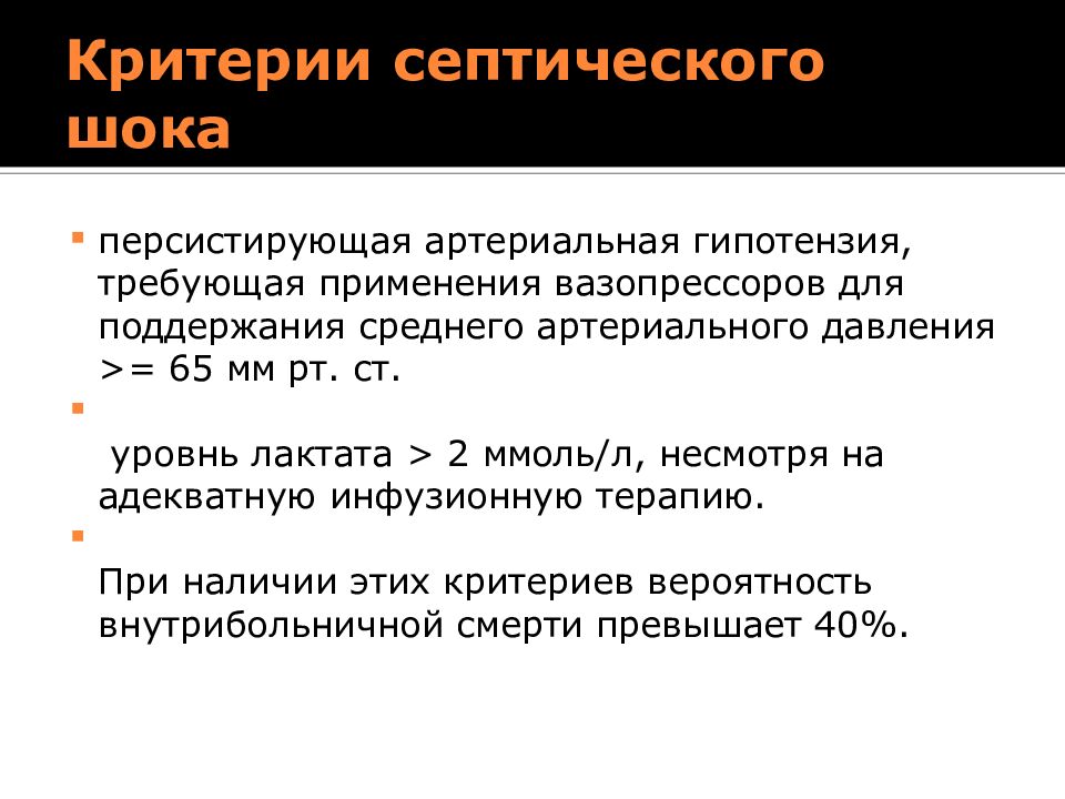 персистирующая артериальная гипотензия, требующая применения вазопрессоров для поддержания среднего артериального давления >= 65 мм рт. ст. уровнь лактата > 2 ммоль /л, несмотря на адекватную инфузионную терапию. При наличии этих критериев вероятность внутрибольничной смерти превышает 40%.