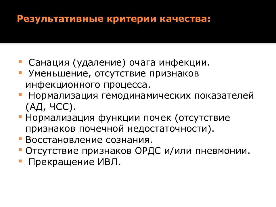 Санация (удаление) очага инфекции. Уменьшение, отсутствие признаков инфекционного процесса. Нормализация гемодинамических показателей (АД, ЧСС). Нормализация функции почек (отсутствие признаков почечной недостаточности). Восстановление сознания. Отсутствие признаков ОРДС и/или пневмонии. Прекращение ИВЛ.