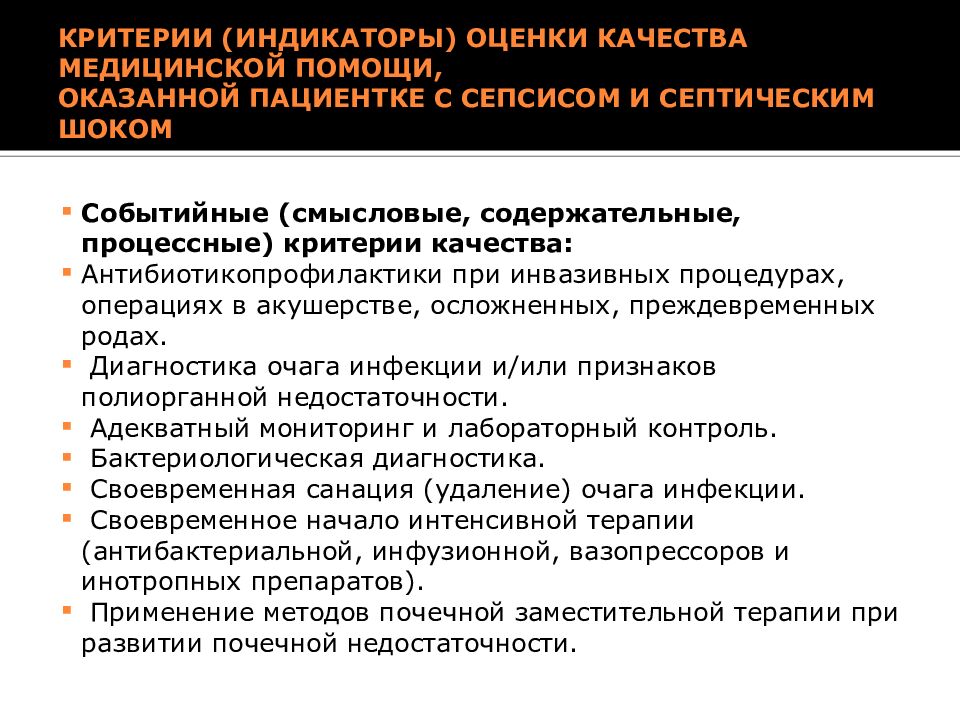 Событийные (смысловые, содержательные, процессные) критерии качества: Антибиотикопрофилактики при инвазивных процедурах, операциях в акушерстве, осложненных, преждевременных родах. Диагностика очага инфекции и/или признаков полиорганной недостаточности. Адекватный мониторинг и лабораторный контроль. Бактериологическая диагностика. Своевременная санация (удаление) очага инфекции. Своевременное начало интенсивной терапии (антибактериальной, инфузионной, вазопрессоров и инотропных препаратов). Применение методов почечной заместительной терапии при развитии почечной недостаточности.