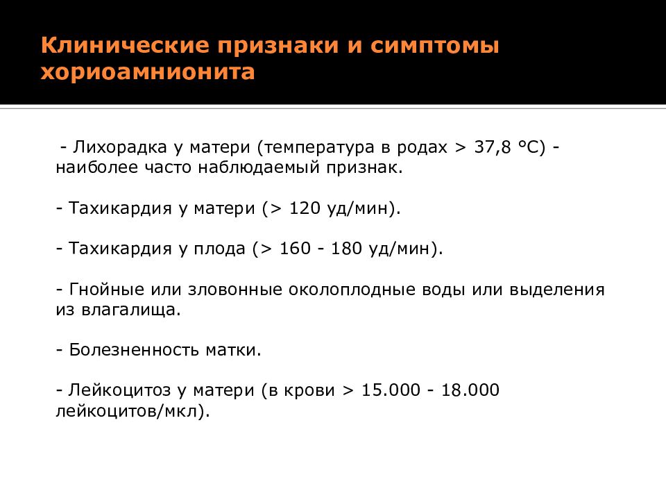 - Лихорадка у матери (температура в родах > 37,8 °C) - наиболее часто наблюдаемый признак. - Тахикардия у матери (> 120 уд/мин). - Тахикардия у плода (> 160 - 180 уд/мин). - Гнойные или зловонные околоплодные воды или выделения из влагалища. - Болезненность матки. - Лейкоцитоз у матери (в крови > 15.000 - 18.000 лейкоцитов/мкл).