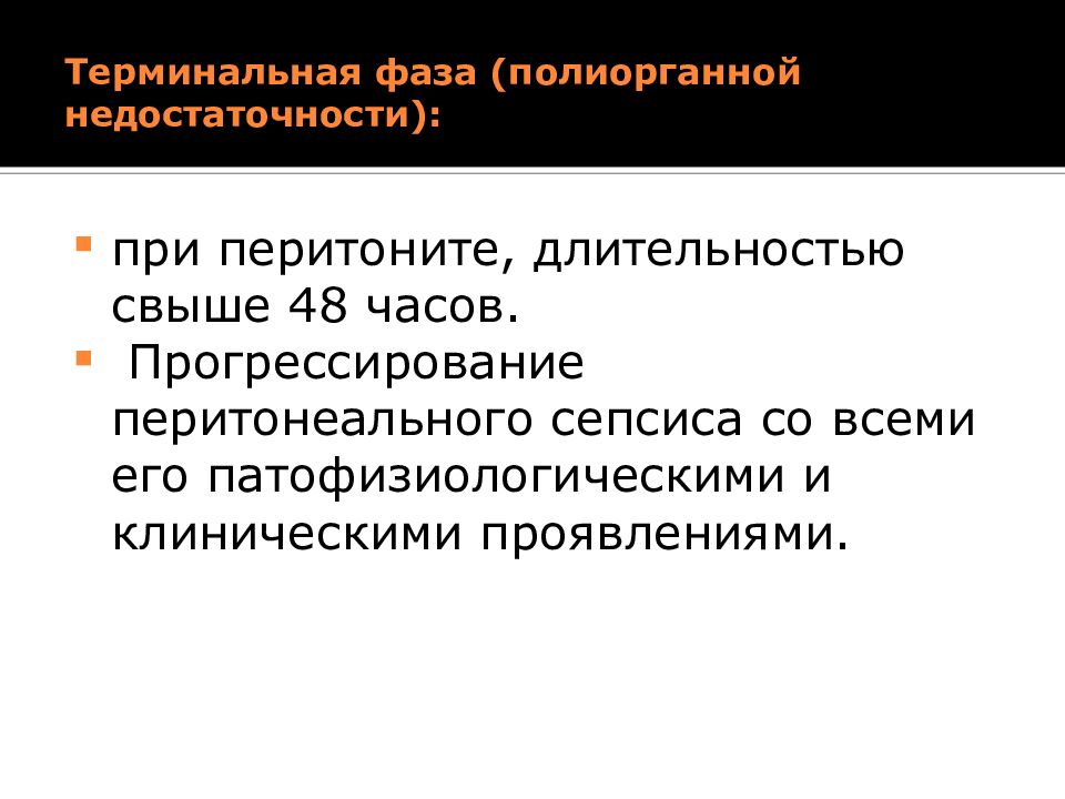 при перитоните, длительностью свыше 48 часов. Прогрессирование перитонеального сепсиса со всеми его патофизиологическими и клиническими проявлениями.