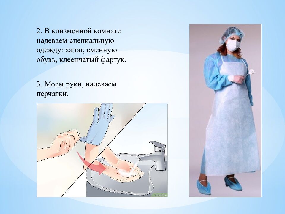 2. В клизменной комнате надеваем специальную одежду: халат, сменную обувь, клеенчатый фартук. 3. Моем руки, надеваем перчатки.