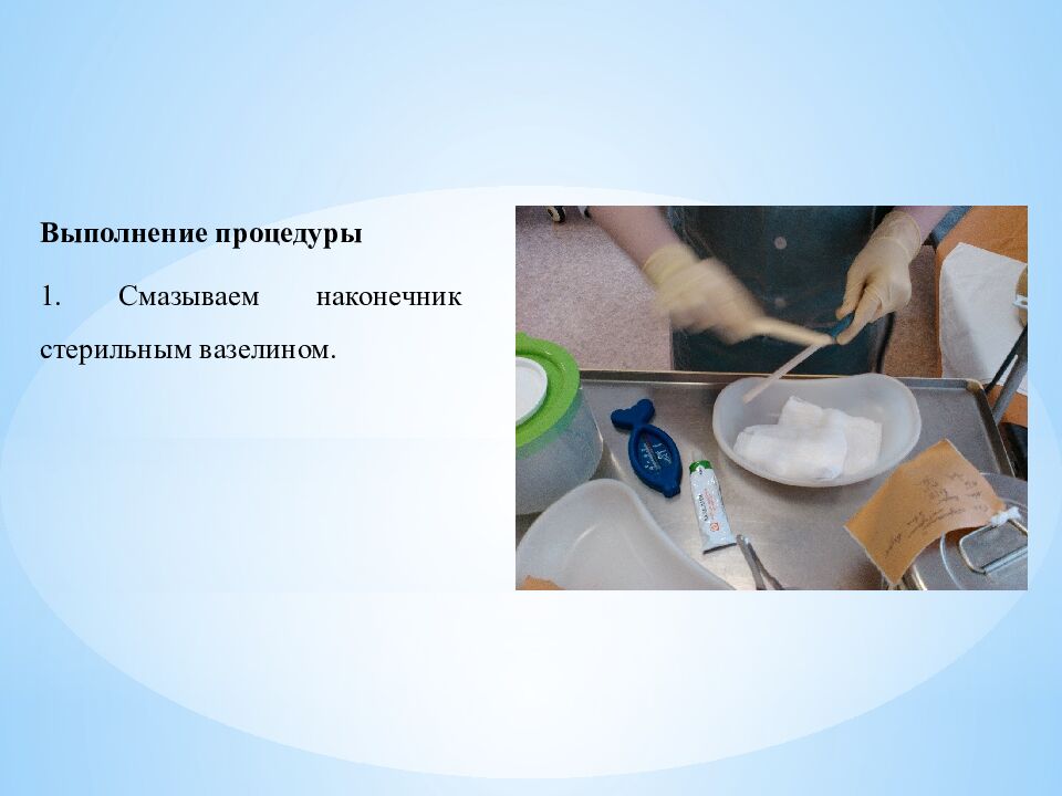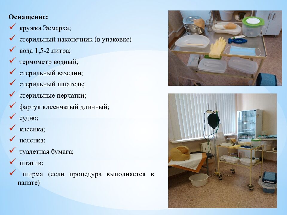 Оснащение: кружка Эсмарха; стерильный наконечник (в упаковке) вода 1,5-2 литра; термометр водный ; стерильный вазелин ; стерильный шпатель; стерильные перчатки; фартук клеенчатый длинный; судно; клеенка; пеленка; туалетная бумага; штатив; ширма (если процедура выполняется в палате)