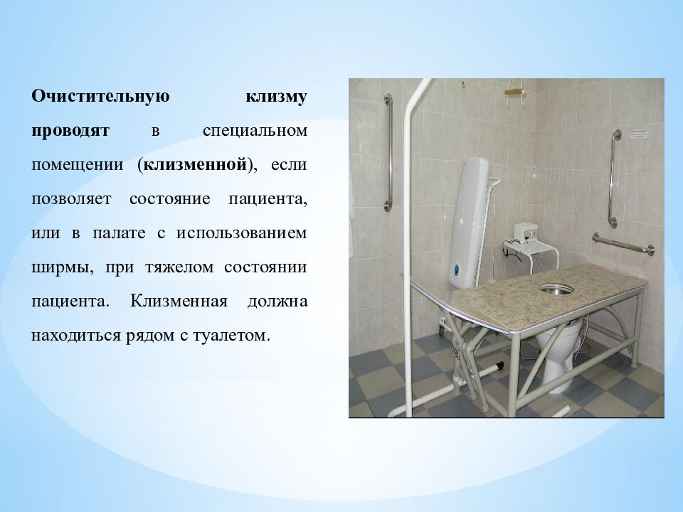 Очистительную клизму проводят в специальном помещении ( клизменной ), если позволяет состояние пациента, или в палате с использованием ширмы, при тяжелом состоянии пациента. Клизменная должна находиться рядом с туалетом.